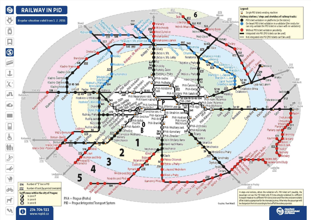 There are four tariff zones in the territory of the City of Prague,“P” (double-zone), “0” and “B”.The surroundings of the City of Prague is divided in seven zones (1,2,3,4,5,6,7), based on the distance.
