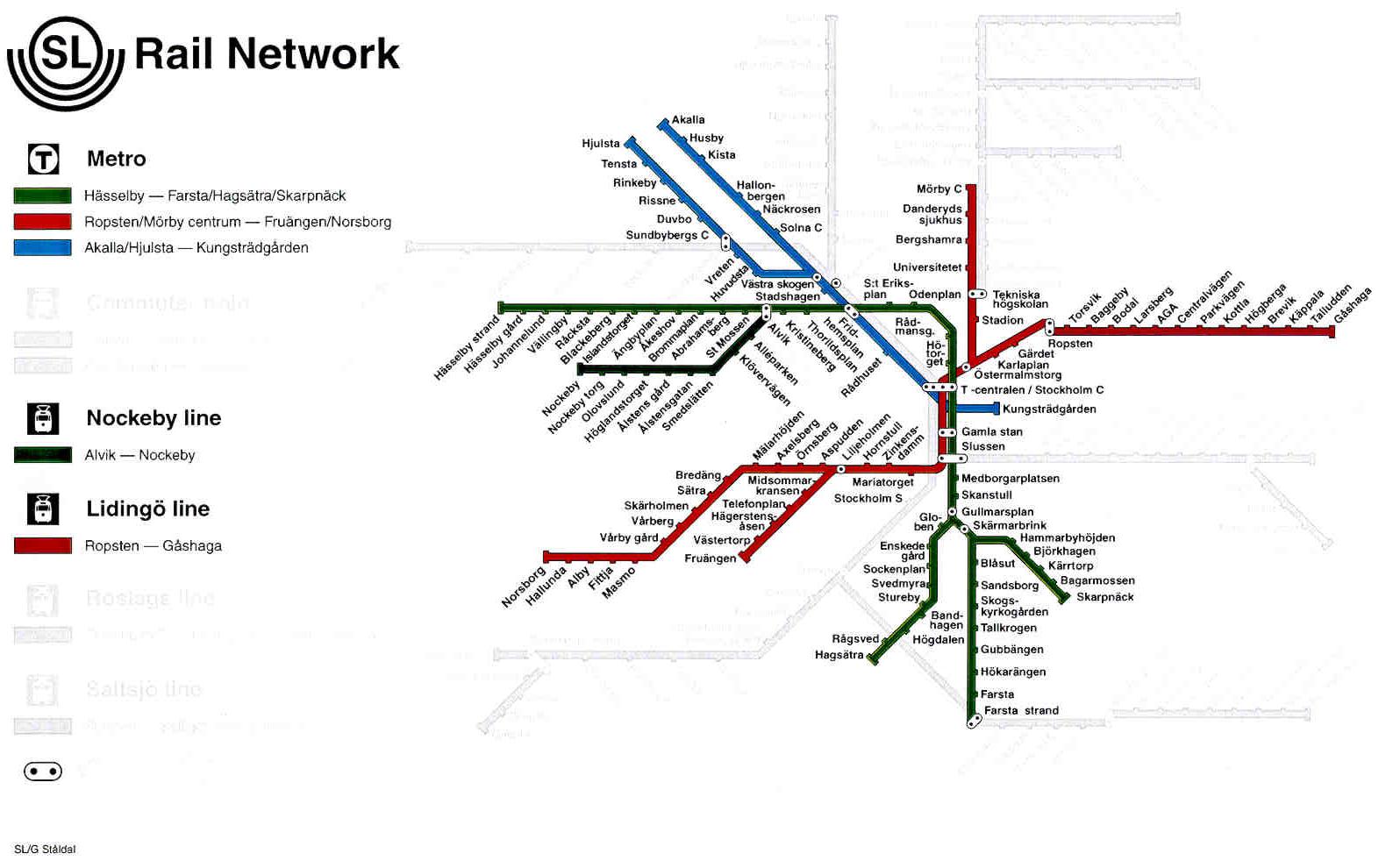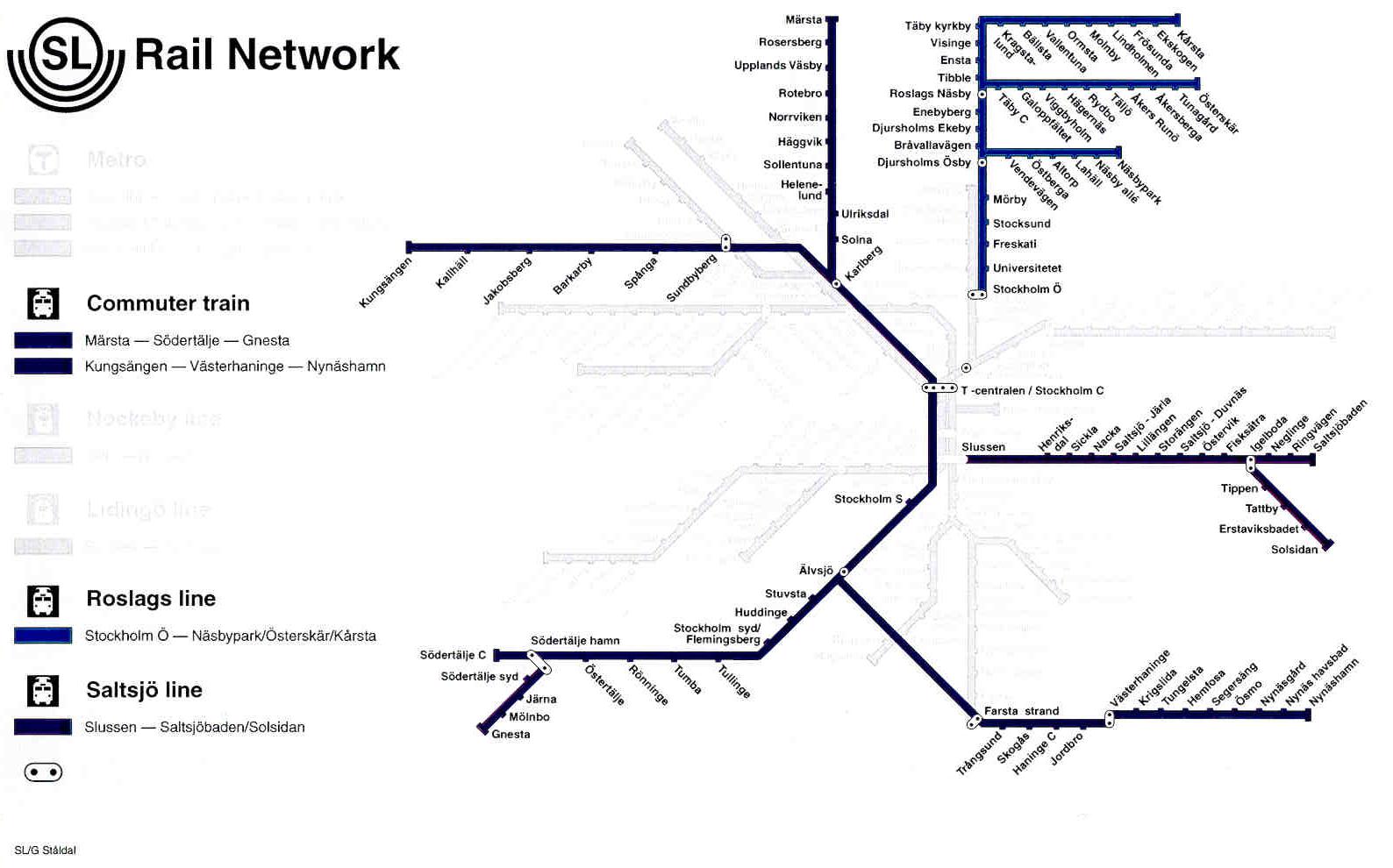 The core of the SL network consists of the metro and commuter train. Rail traffic also consists of suburban railways and tramways. The bus network covers the entire county. Every weekday a total of more than 739 000 travelers travel with SL. The total number of boardings, i.e. segment journeys on a typical weekday is 2,6 million.