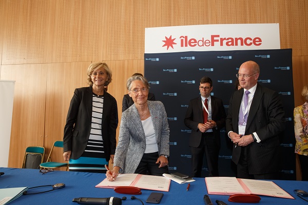President of Region Ile de France Mme Valérie Pécresse, minister of Transports Mme Elisabeth Borne and dr Jon Lamonte, chair of EMTA placing their signatures on the Declaration of Intent.